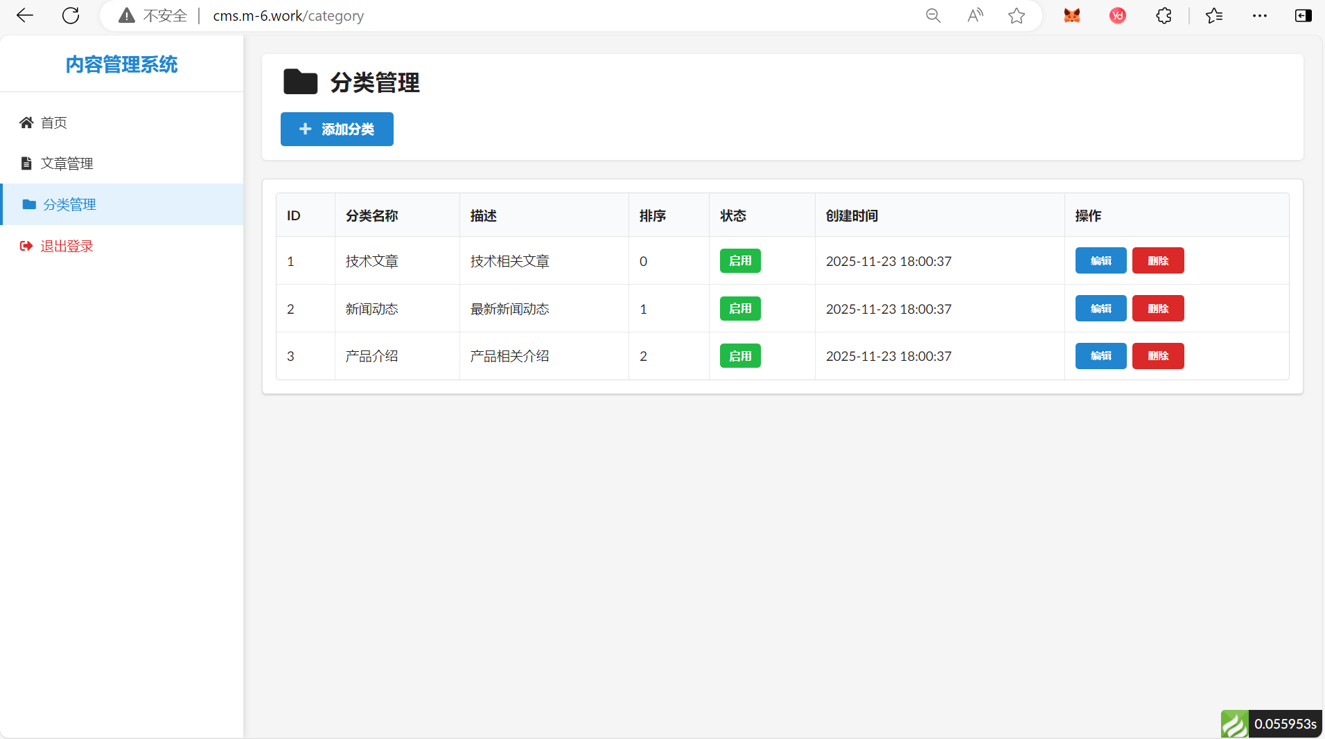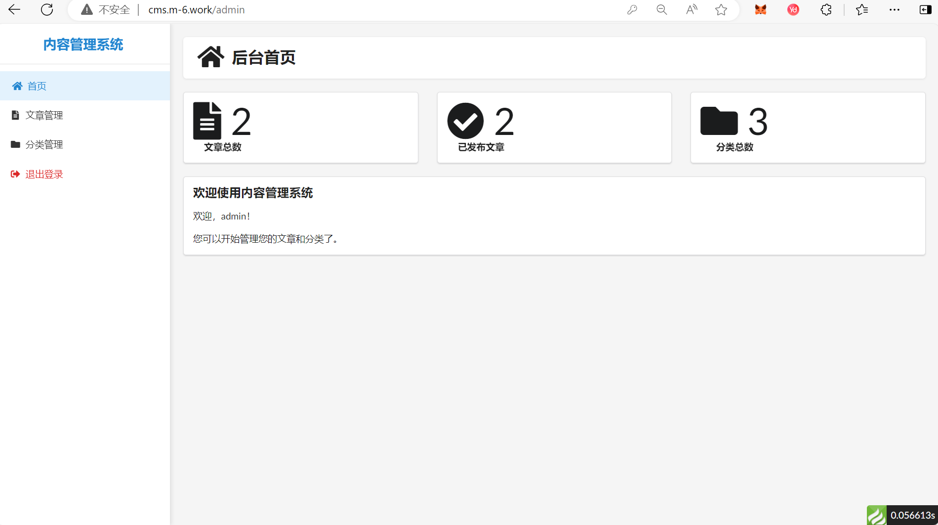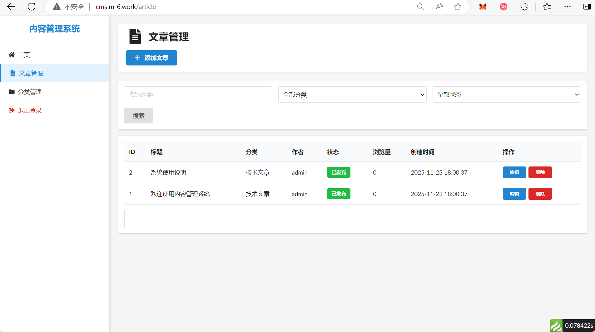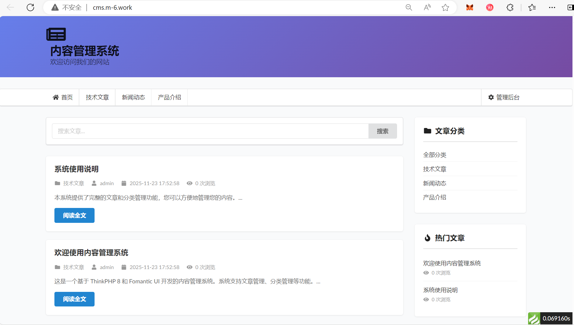 这是一个基于ThinkPHP 8和Fomantic UI开发的简单内容管理系统(CMS),系统采用传统的服务端渲染方式,提供了完整的文章管理、分类管理等两功能,其他功能未开发。(借助了AI的开发)